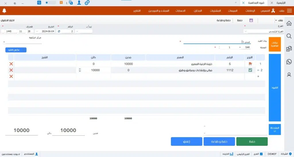 بعد إدخال جميع التفاصيل، اضغط على “حفظ” لتسجيل القيد في النظام.